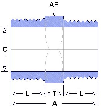 | Nominal Pipe Size | Min. Length of Ext. Thread for Basic Guage Length plus Die Clearance | Thickness of Hexagon | Overall Length | Diameter of Bore (max) | Width Across Flats of Hexagon | Approximate Weight (Kg) |